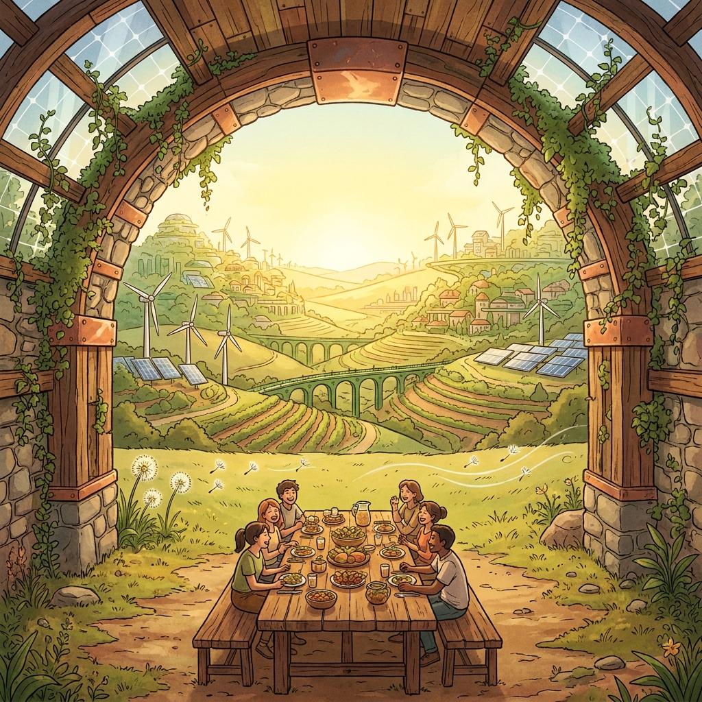 Create distinctive visual language and brand guidelines covering: curvilinear/flowing forms, hand-feeling imperfection, earth tones with less stark contrast, geodesic/organic architecture references, earth-from-above imagery, cultural glyphs and ancient markings integration, fractal but grounded (not digitally trippy) aesthetic. Working aesthetic anchor: "grounded solarpunk". Portal/doorway shapes emerging as compelling visual device. Guidelines must address multi-generationally aspirational positioning while maintaining tangible rooted-in-now expression - speaking to spectrum from local community members to solarpunk funders. Avoiding spiritual bypass/Mexico City boutique hotel aesthetic in favor of lived-in, rooted feeling.