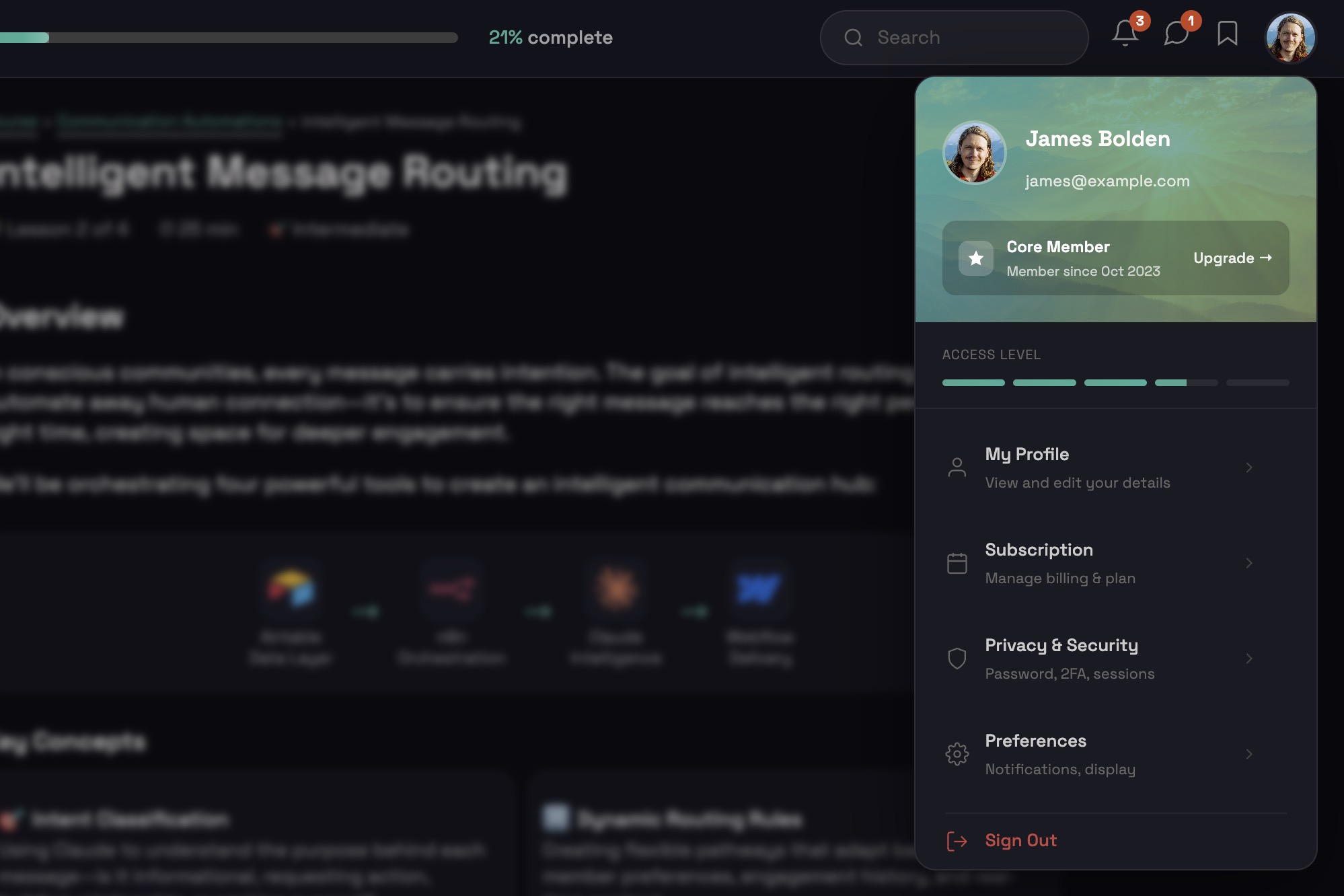 The membership platform we're building now allow us to create authenticated user pathways through fully customizable content architectures. After working with consciousness communities for years, we've learned that access control needs to be nuanced, honoring both the need for open exploration and the value of committed spaces. Our systems let organizations create graduated pathways where members naturally move deeper as their relationship with the community evolves.